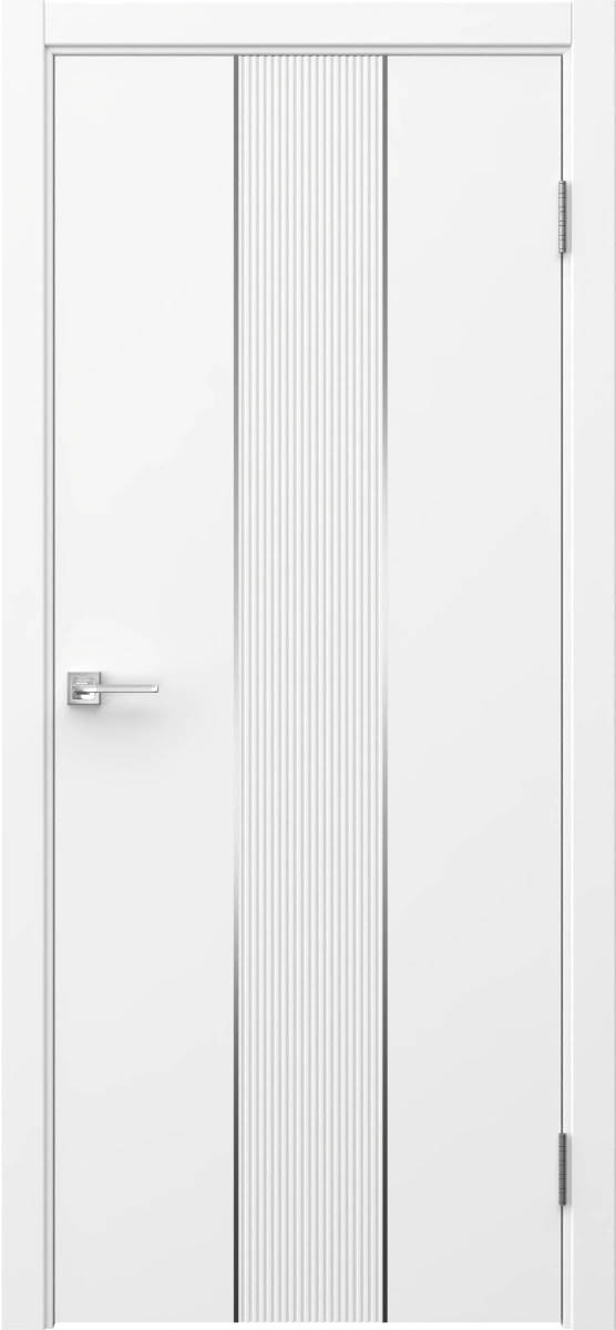 Межкомнатная современная фрезерованная каркасная дверь, покрытая эмалью белого цвета (RAL 9003), глухая, с серебряным молдингом. Изготовлена из срощенного бруса сосны, МДФ и сотового наполнителя. Комплектация включает в себя дверную коробку с телескопическим наличником. Производятся под заказ двери нестандартных размеров.