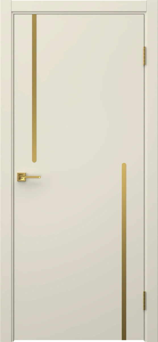 Межкомнатная современная каркасная дверь, покрытая эмалью цвета RAL 9001 (кремово-белый), глухая, с золотым молдингом. Полотно изготовлено из срощенного соснового бруса, сотового наполнителя и МДФ. Дверная коробка с телескопическим наличником входит в комплект. Под заказ производятся двери нестандартных габаритов.