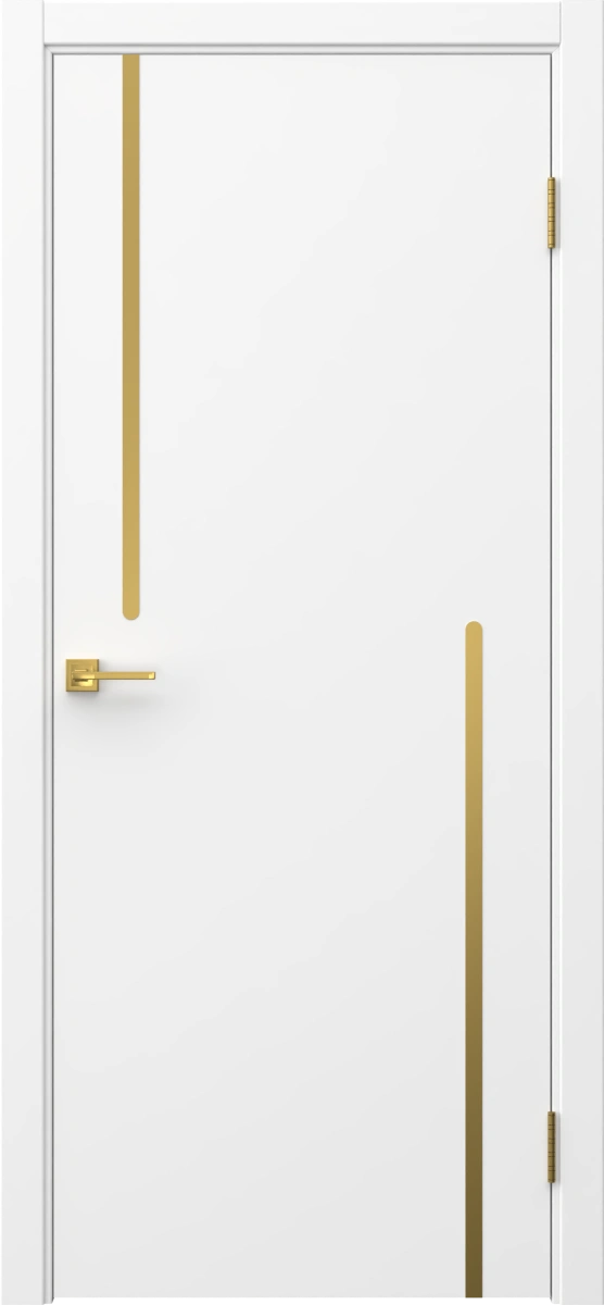 Межкомнатная современная каркасная дверь, покрытая эмалью белого цвета (RAL 9003), глухая, с золотым молдингом. Полотно изготовлено из срощенного бруса сосны, МДФ и сотового наполнителя. Дверная коробка с телескопическим наличником входит в комплект. Возможно изготовление дверей нестандартных размеров.
