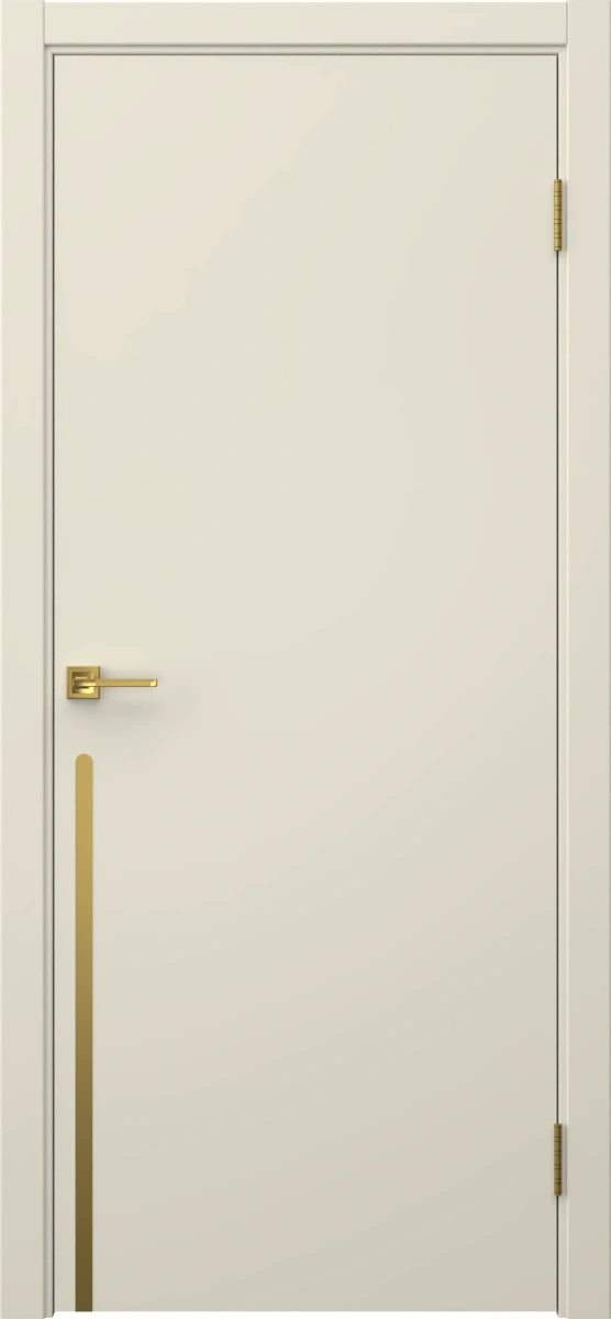Межкомнатная современная каркасная дверь, покрытая эмалью в цвете RAL 9001 (кремово-белый), глухая, с золотым молдингом. Изготовлена из срощенного бруса сосны, МДФ и сотового наполнителя. В комплект входит дверная коробка с телескопическим наличником. Возможно изготовление дверей нестандартных размеров.