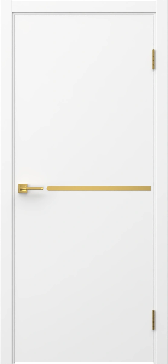 Межкомнатная современная каркасная дверь, покрытая эмалью белого цвета (RAL 9003), глухая, с золотым молдингом. Изготовлена из срощенного соснового бруса, МДФ и сотового наполнителя. Комплектация включает в себя дверную коробку с телескопическим наличником. Изготавливаются под заказ двери нестандартных размеров.