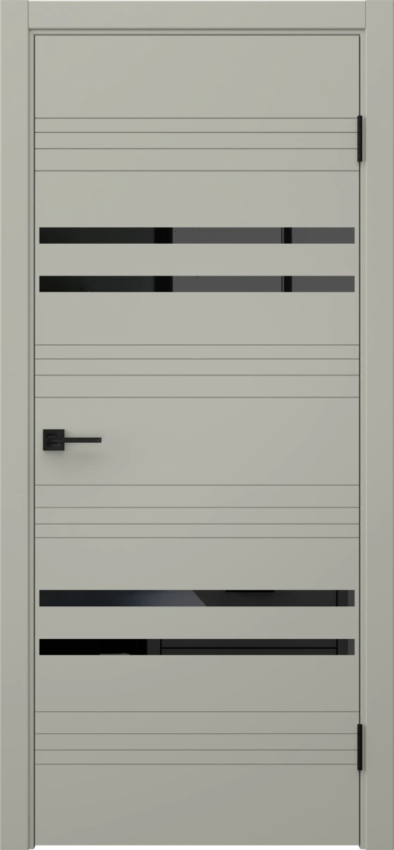 Межкомнатная современная фрезерованная каркасная дверь, покрытая эмалью цвета RAL 7044 (серый шелк), со стеклом лакобель черный. Полотно изготовлено из срощенного соснового бруса, сотового наполнителя и МДФ. Комплектация включает в себя дверную коробку с телескопическим наличником. Производятся под заказ двери нестандартных размеров.