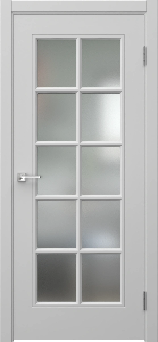 Межкомнатная классическая фрезерованная каркасная дверь с решеткой, покрытая эмалью цвета RAL 7047 (телегрей 4), с матовым стеклом (сатинат). Полотно изготовлено из срощенного бруса сосны, МДФ и сотового наполнителя. В комплект входит дверная коробка с телескопическим наличником. Изготавливаются под заказ двери нестандартных размеров.