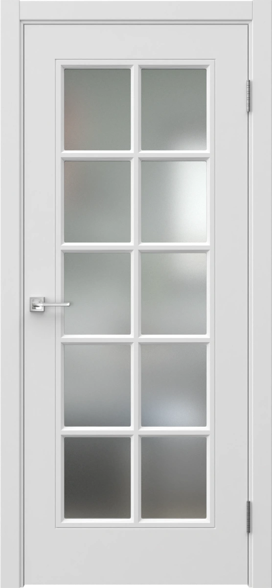 Межкомнатная классическая фрезерованная каркасная дверь с решеткой, покрытая эмалью белого цвета (RAL 9003), с матовым стеклом (сатинат). Изготовлена из срощенного бруса сосны, МДФ и сотового наполнителя. Дверная коробка с телескопическим наличником входит в комплект. Изготавливаются под заказ двери нестандартных размеров.