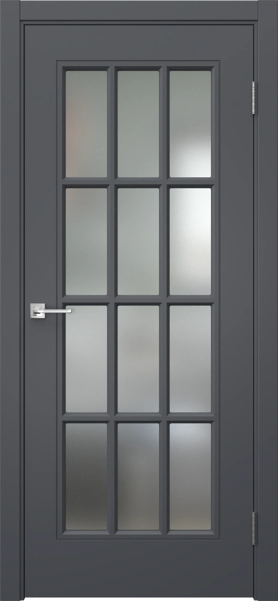 Межкомнатная классическая фрезерованная каркасная дверь с решеткой, покрытая эмалью цвета «графит», с матовым стеклом (сатинат). Изготовлена из срощенного бруса сосны, МДФ и сотового наполнителя. В комплект входит дверная коробка с телескопическим наличником. Производятся под заказ двери нестандартных размеров.