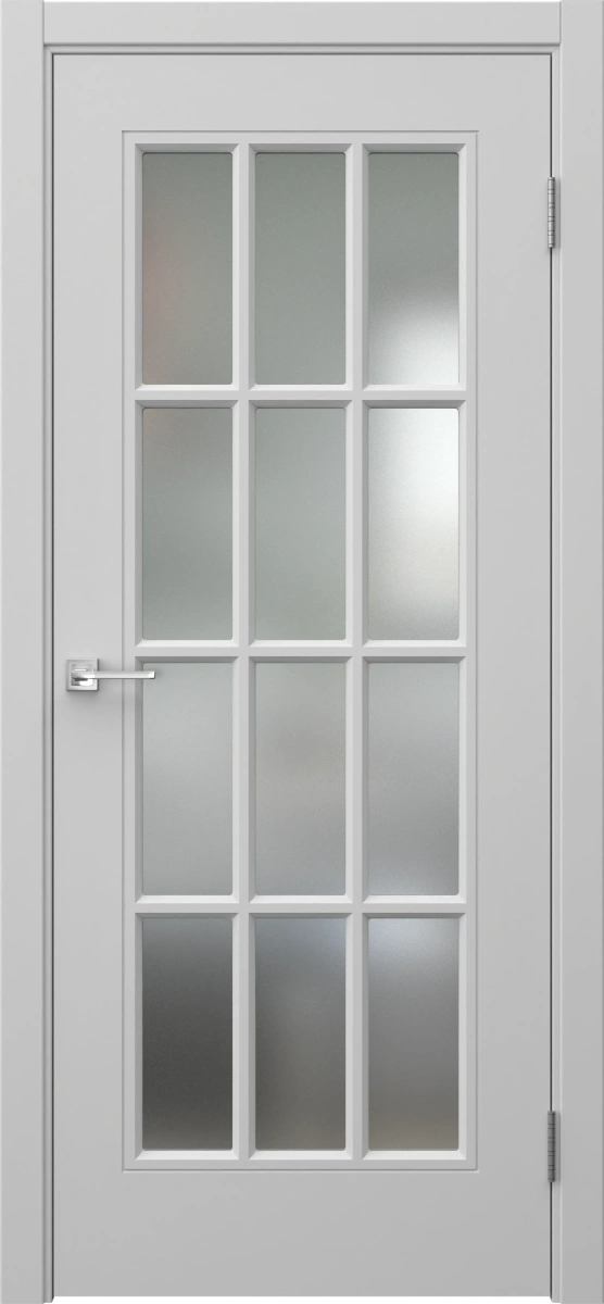 Межкомнатная классическая каркасная фрезерованная дверь с решеткой, покрытая эмалью в цвете RAL 7047 (телегрей 4), с матовым стеклом (сатинат). Полотно изготовлено из срощенного соснового бруса, сотового наполнителя и МДФ. Комплектуется дверной коробкой с телескопическим наличником. Возможно изготовление дверей нестандартных размеров.