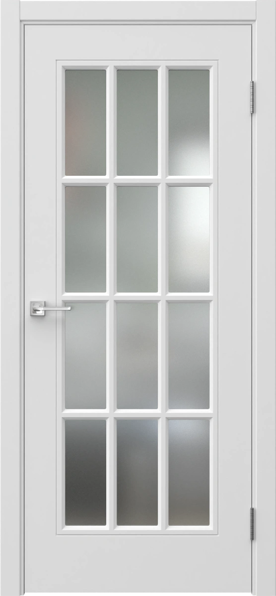 Межкомнатная классическая каркасная фрезерованная дверь с решеткой, покрытая эмалью белого цвета (RAL 9003), с матовым стеклом (сатинат). Полотно изготовлено из срощенного соснового бруса, сотового наполнителя и МДФ. В комплект входит дверная коробка с телескопическим наличником. Изготавливаются под заказ двери нестандартных размеров.