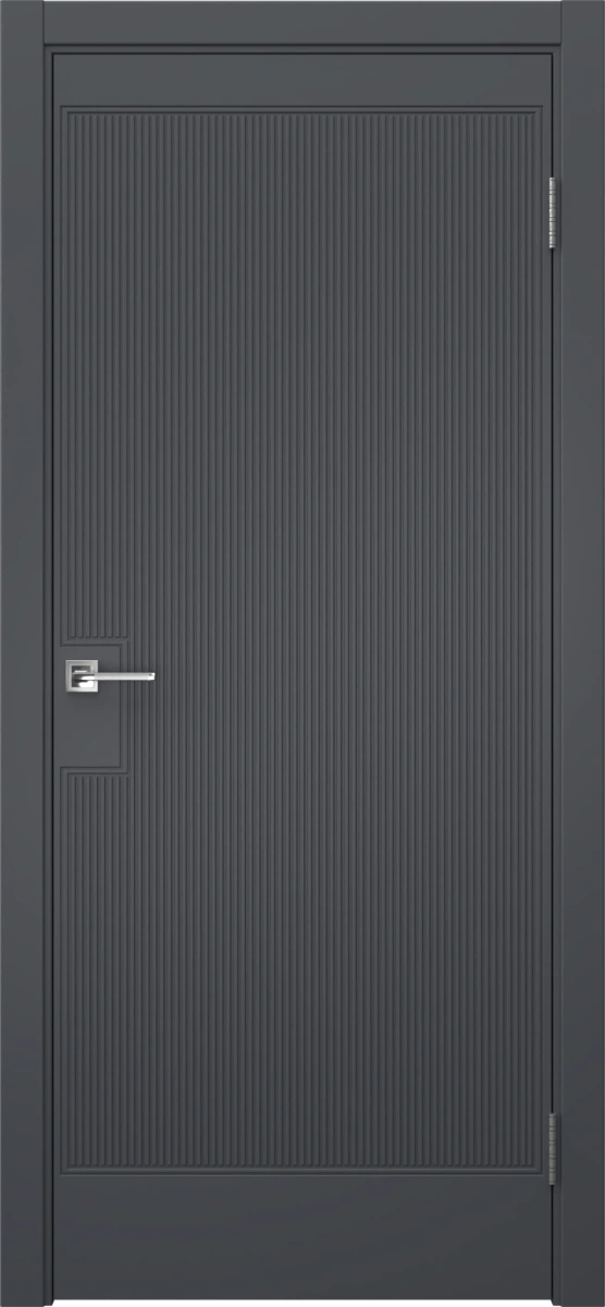 Современная каркасная фрезерованная межкомнатная дверь, покрытая эмалью цвета «графит», глухая. Изготовлена из срощенного соснового бруса, МДФ и сотового наполнителя. Комплектация включает в себя дверную коробку с телескопическими наличниками. Под заказ производятся двери нестандартных габаритов.