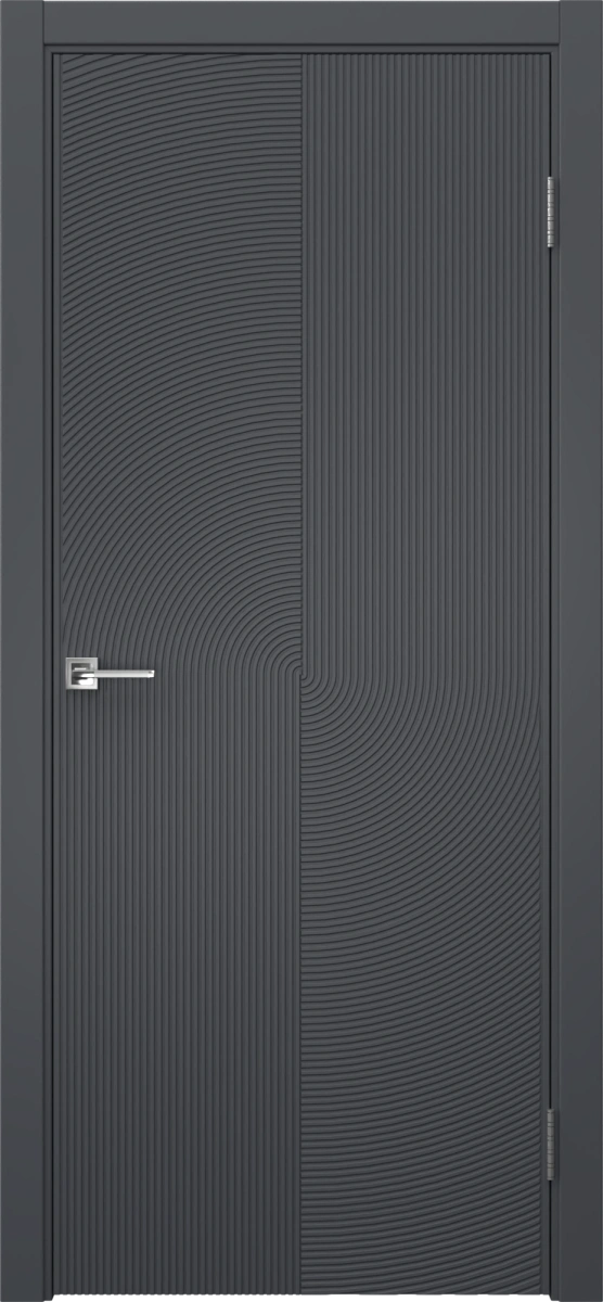 Современная каркасная фрезерованная межкомнатная дверь, покрытая эмалью цвета «графит», глухая. Полотно изготовлено из срощенного соснового бруса, сотового наполнителя и МДФ. Комплектация включает в себя дверную коробку с телескопическими наличниками. Производятся под заказ двери нестандартных размеров.