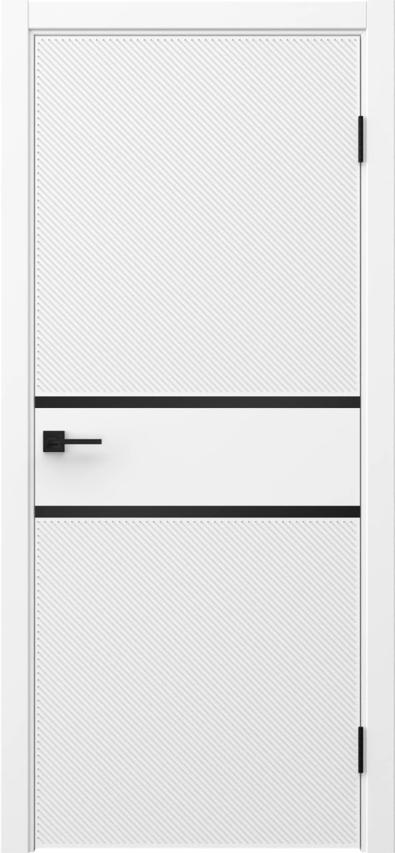 Современная каркасная межкомнатная дверь, покрытая белой эмалью (RAL 9003), глухая, с черным пластиковым молдингом. Изготовлена из срощенного бруса сосны, МДФ и сотового наполнителя. Дверная коробка входит в комплект. Возможно изготовление дверей нестандартных размеров.
