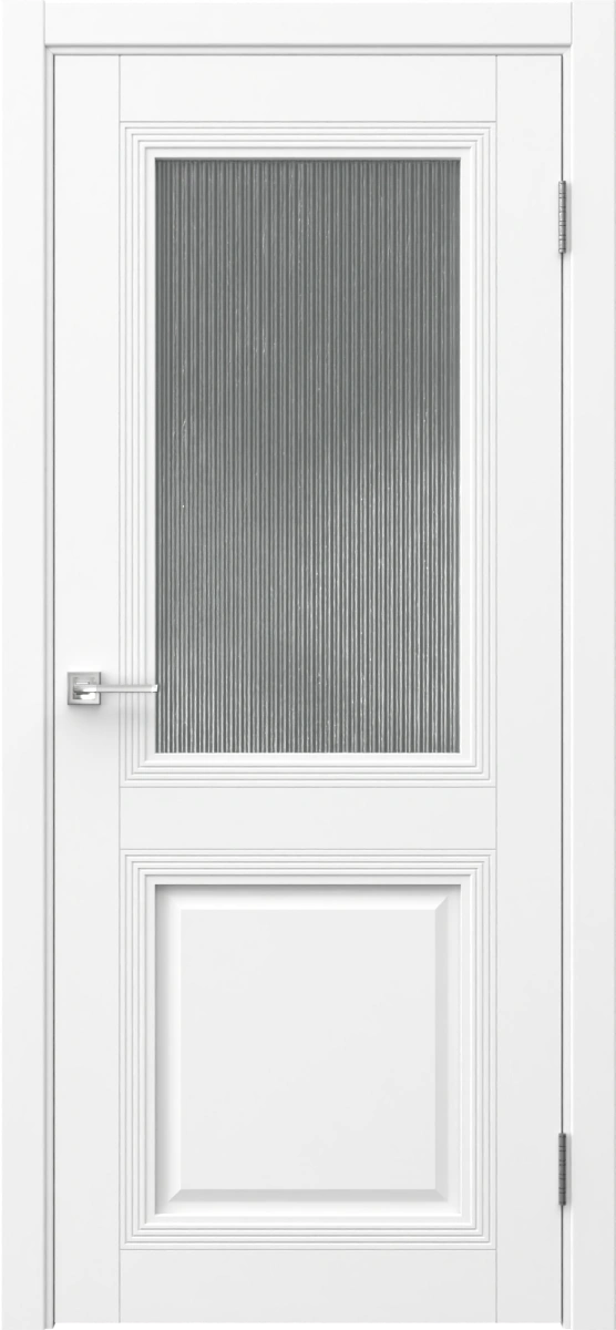 Классическая межкомнатная дверь с багетом покрытая экошпоном цвета «аляска», с рифленым матовым стеклом. Полотно изготовлено из срощенного бруса сосны, МДФ и сотового наполнителя. Комплектуется дверной коробкой с телескопическими наличниками. Под заказ производятся двери нестандартных габаритов.